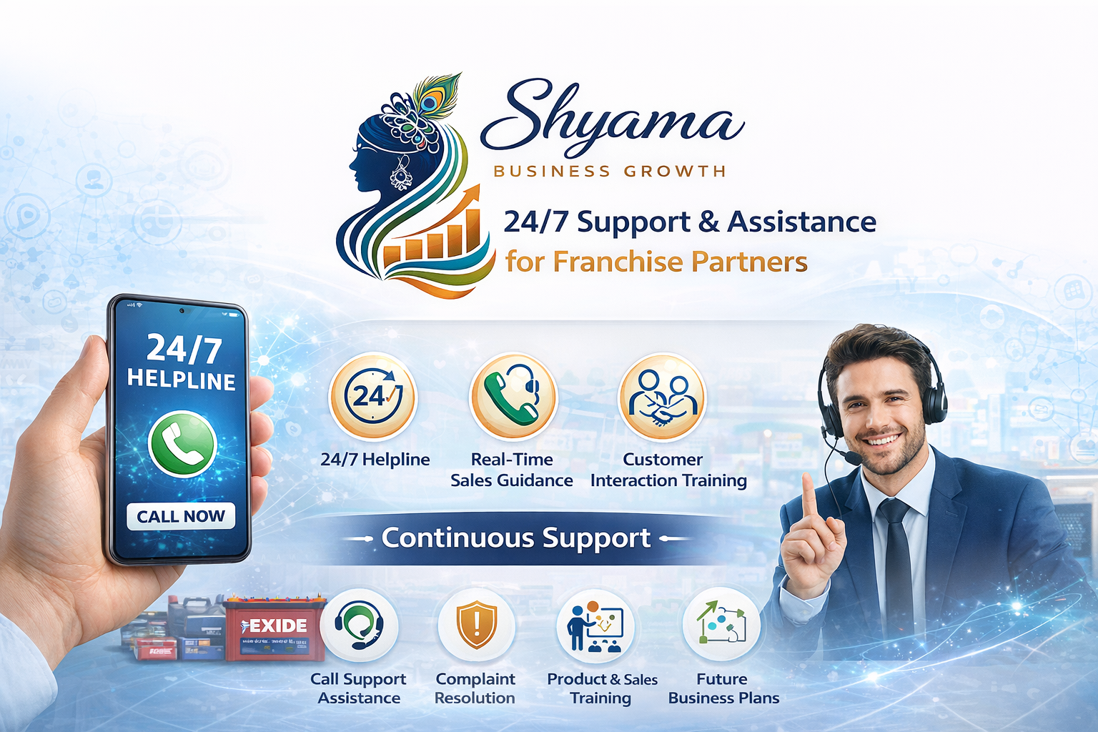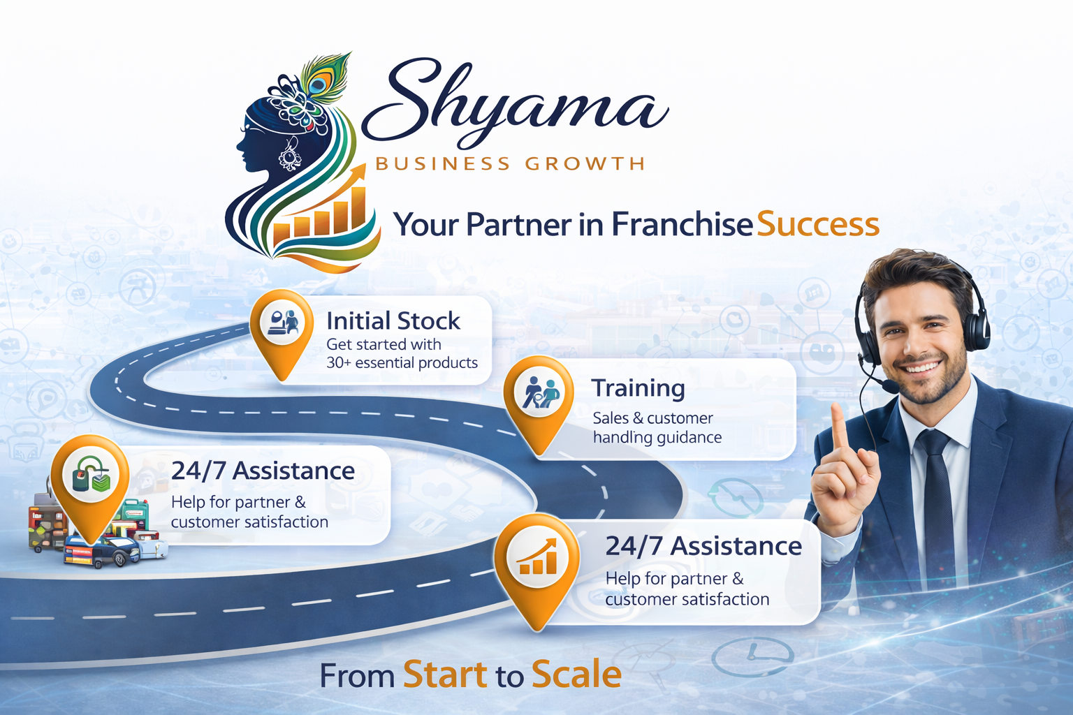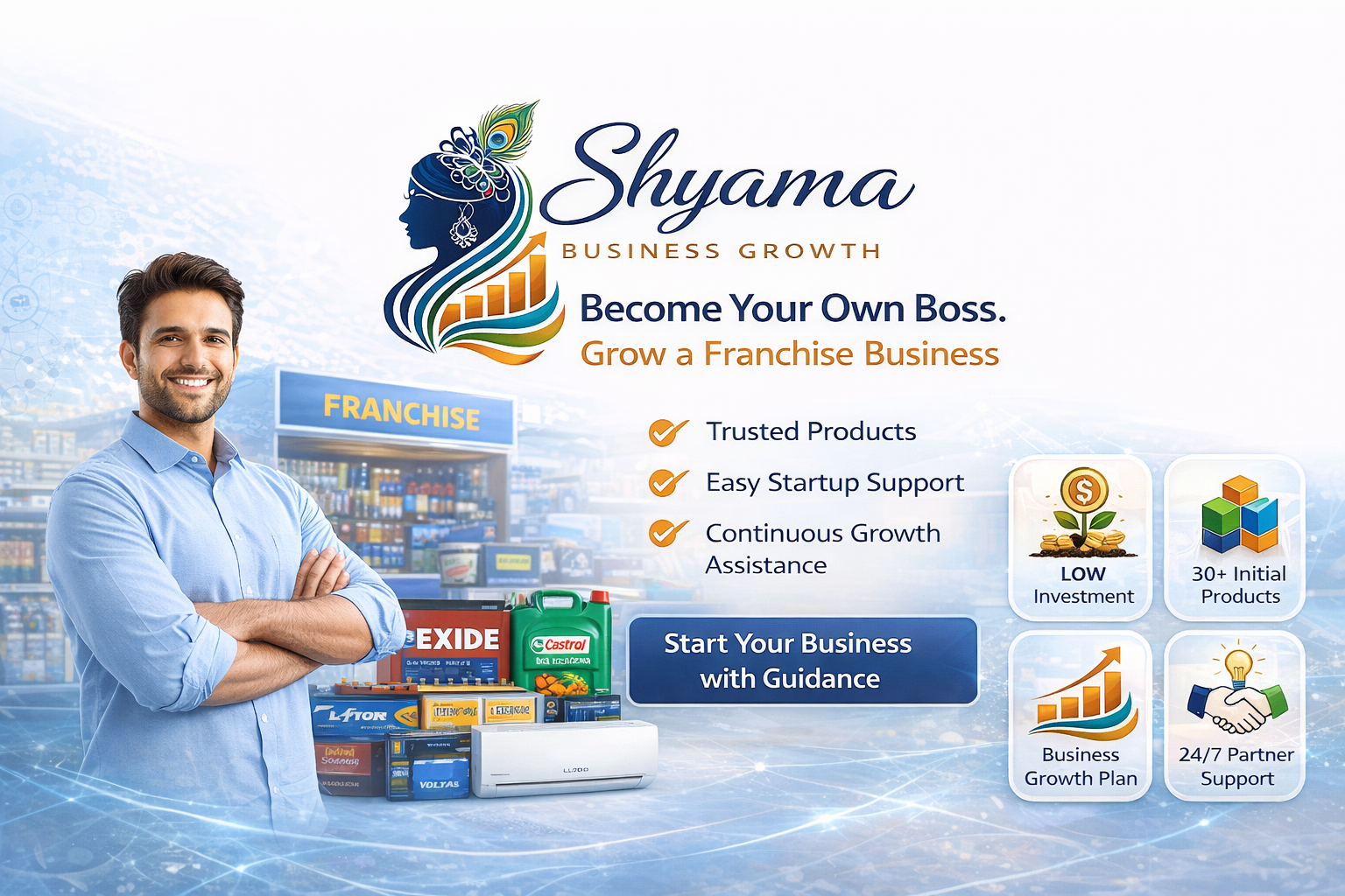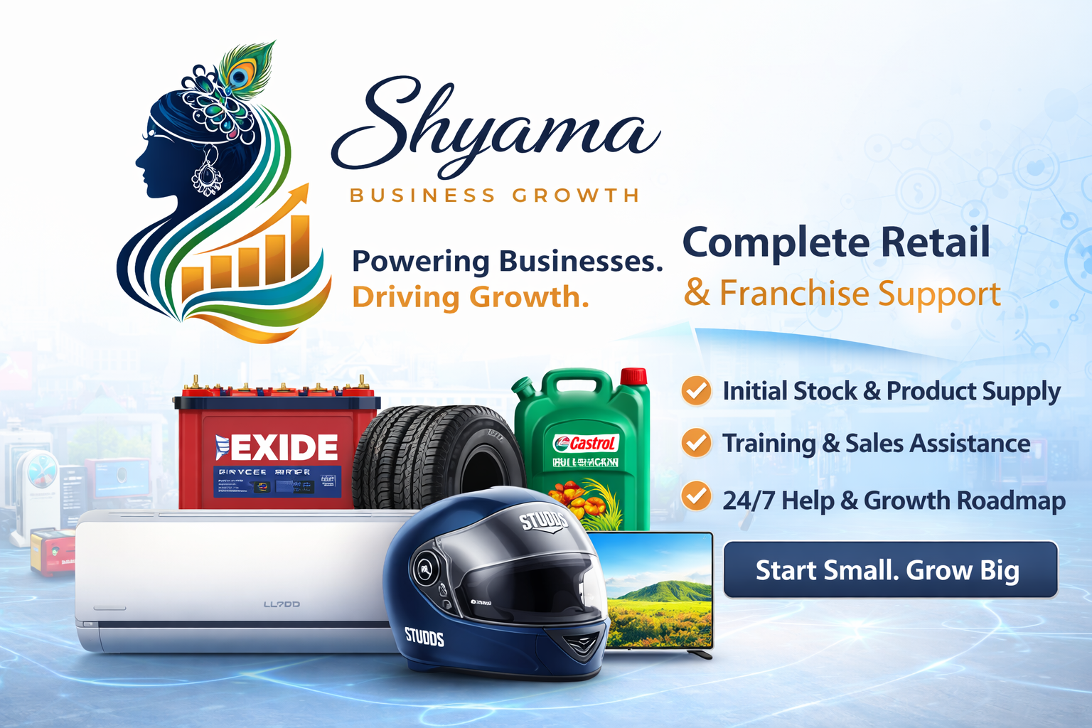 Shyama Business Growth is a complete retail and franchise support platform designed to help individuals start and grow profitable businesses with confidence. We provide initial stock (30–40 essential products), including batteries, tyres, lubricants, home appliances, helmets, and more — along with complete sales guidance, training, and 24/7 assistance. Our model ensures that partners are never alone. From customer handling to complaint resolution and growth planning, we provide continuous support to help every franchise succeed and expand. We believe in building long-term partnerships — not just supplying products.
